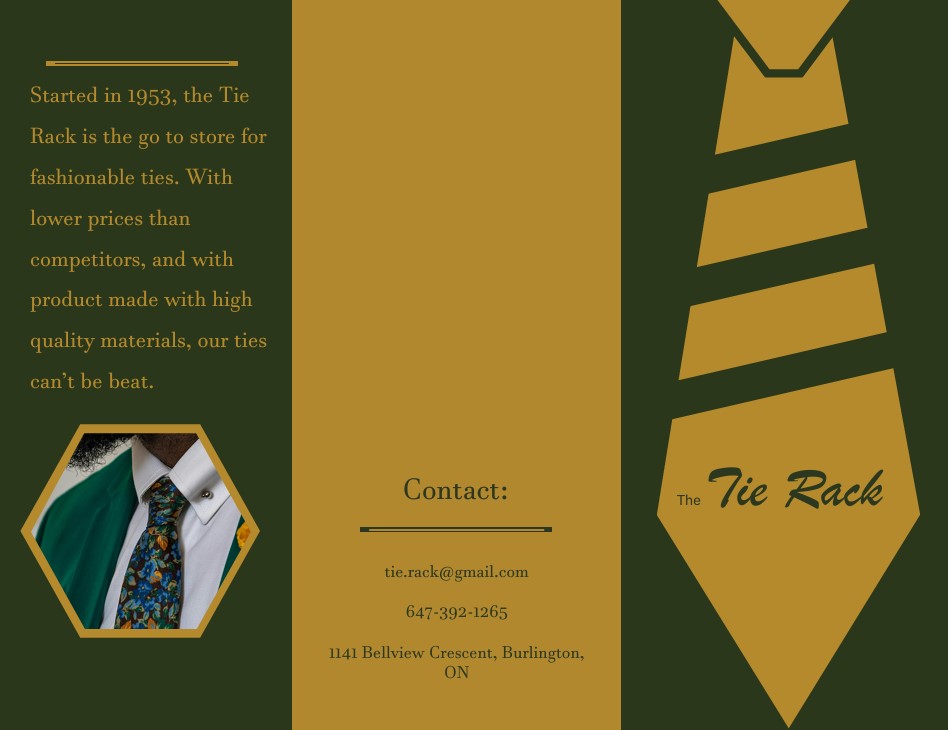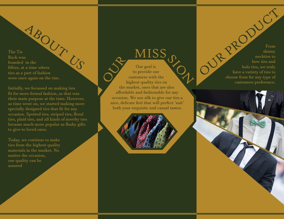 The tri-fold brochure project required me to think a bit more creatively, as I was forced to consider how a design should flow throughout six different pages, yet still being unified in the end. I decided that I would use Illustrator as my main tool, designing around two different ties for both the cover page and the inside pages.